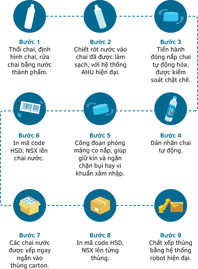 9 bước đóng chai thành phẩm: dòng chai 350ml, 500ml, 1.5 Lít